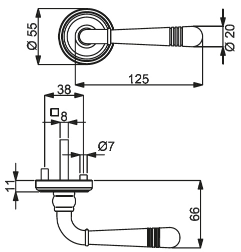- Klika pevně spojená s rozetou a pružinovým mechanismem.