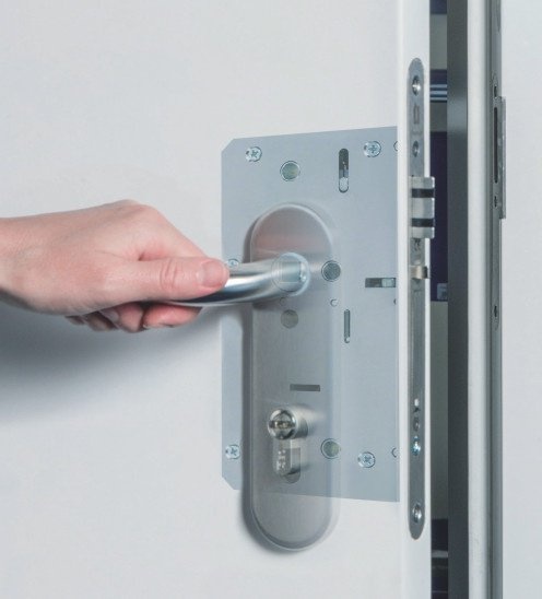 Zámek je nutné vždy osadit sestavou kování klika/klika. V neaktivním stavu jsou dveře vždy uzamčeny samozamykací střelkou a vnější klika je po stisknutí pasivní.