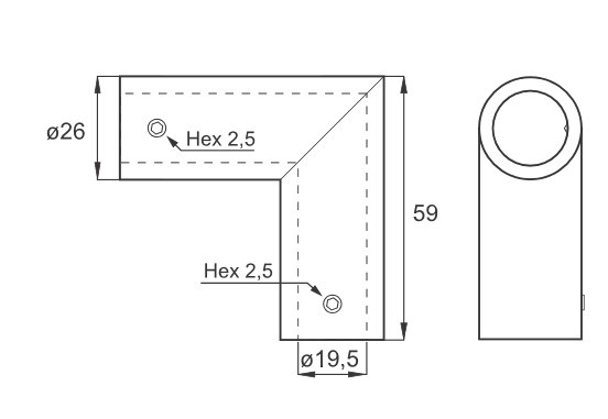 Spojka L pro stabilizační nerezové trubky s průměrem 19 mm.