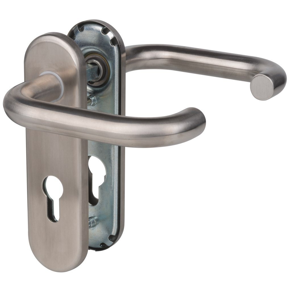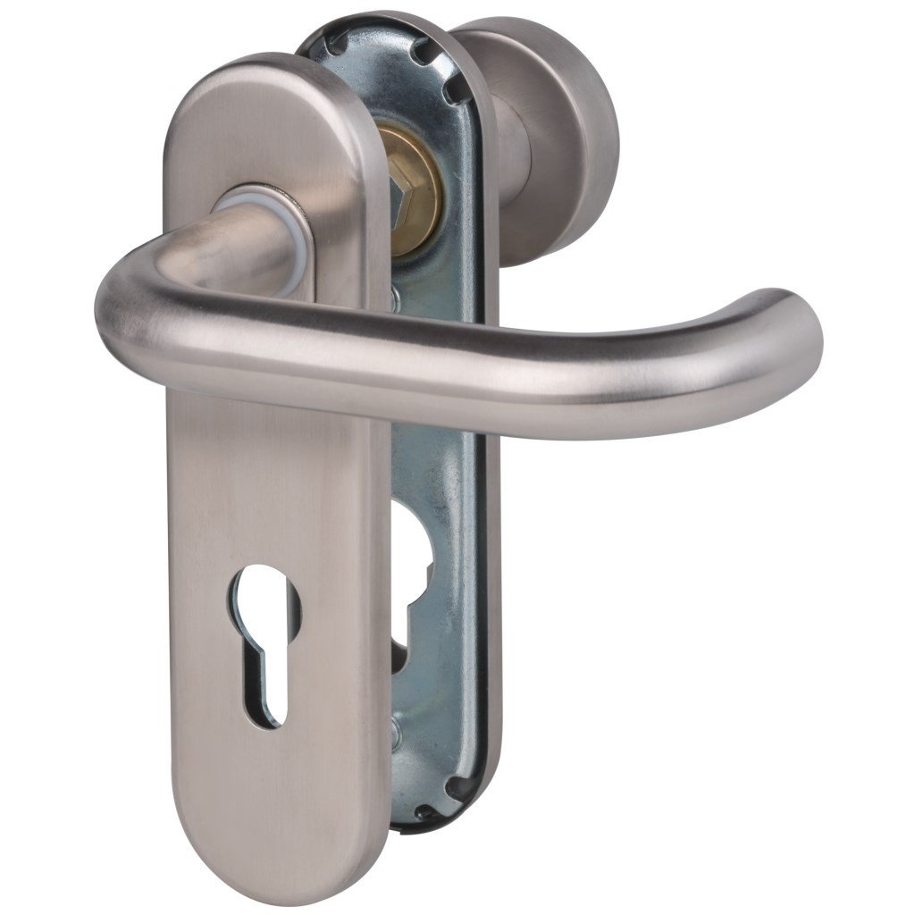 Kovová konstrukce a kliky pevně spojené se štítkem umožňují použití i ve dveřích kde je vysoká frekvence pohybu osob.