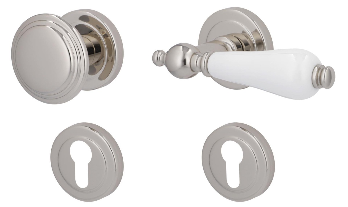 Kování je vyrobeno z masivní mosazi s leštěným povrchem v kombinaci s bílou keramikou.