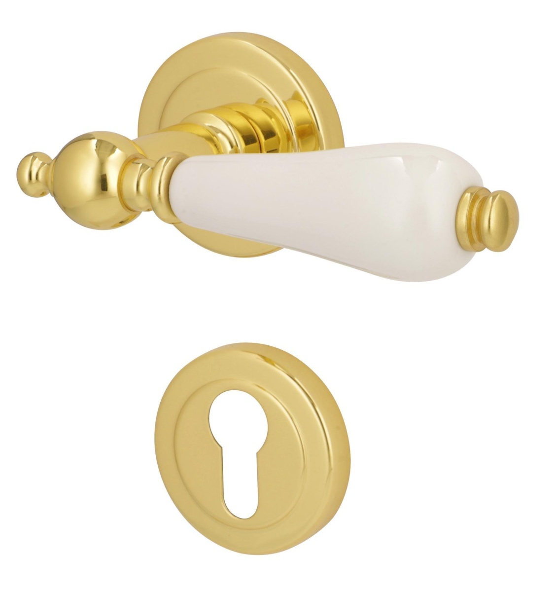 Kování je vyrobeno z masivní mosazi s leštěným povrchem v kombinaci s bílou keramikou.