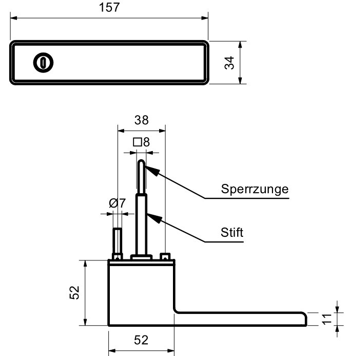 Rozměry: délka 156 mm, šířka 34 mm, hloubka 52 mm