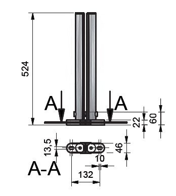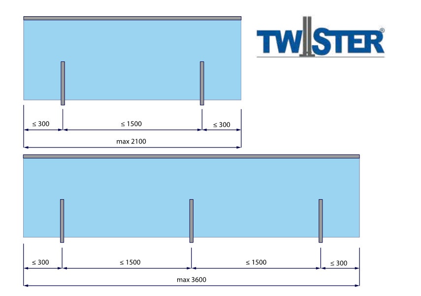 Maximální rozpětí skleněné desky při dvou úchytech činí 2100 mm při maximální vzdálenosti sloupků 1500 mm
