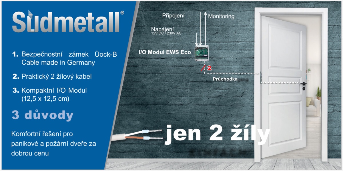 - napájení zajištěno 2 žílovým kabelem napojeným do I/O modulu EWS. Vzdálenost od modulu může být až 20 metrů