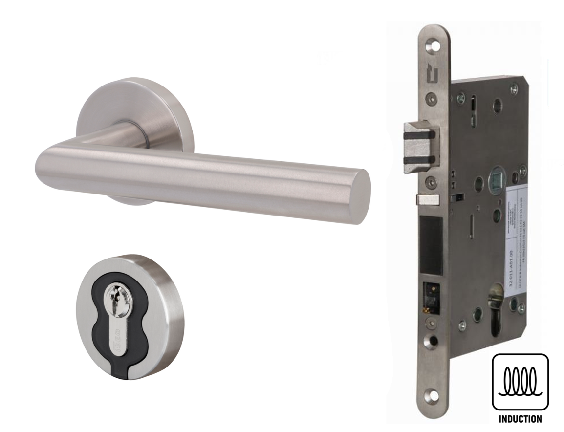 Dveřní klika s integrovanou čtečkou karet a zámkem a indukčním nabíjením z protiplechu. Indukční nabíjení zajistí bezproblémový chod zámku bez rizika vybití baterie a nutnosti sledovat stav baterií. Výhodou je to, že není nutno řešit kabeláž ve dveřním křídle a průchodku mezi dveřmi a zárubní. Kabeláž se instaluje pouze ke speciálnímu protiplechu v zárubni.