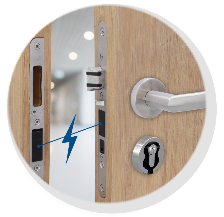 - Zámek je indukčně nabíjen z protiplechu v zárubni. Nepotřebujete žádnou kabeláž ve dveřích ani průchodku mezi křídlem a zárubní.