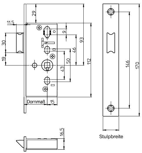 Úzký zámek pro rámové dveře střelkový bez závory, krátký