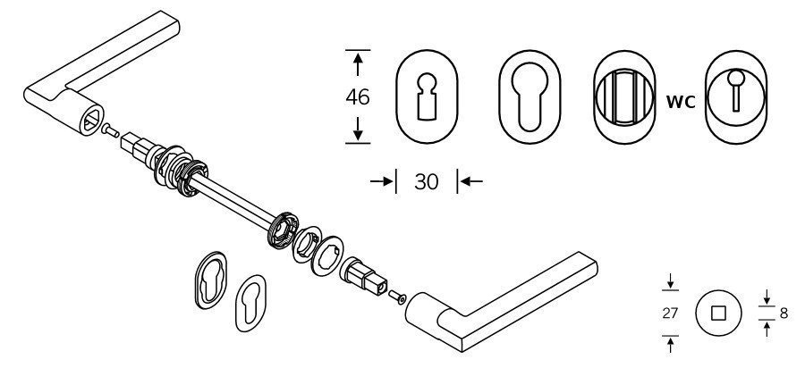 Kování s WC zamykáním je standardně dodáváno s redukcí čtyřhranu 6/8 mm. WC klička je tedy kompatibilní s WC zámky 6 mm a 8 mm.